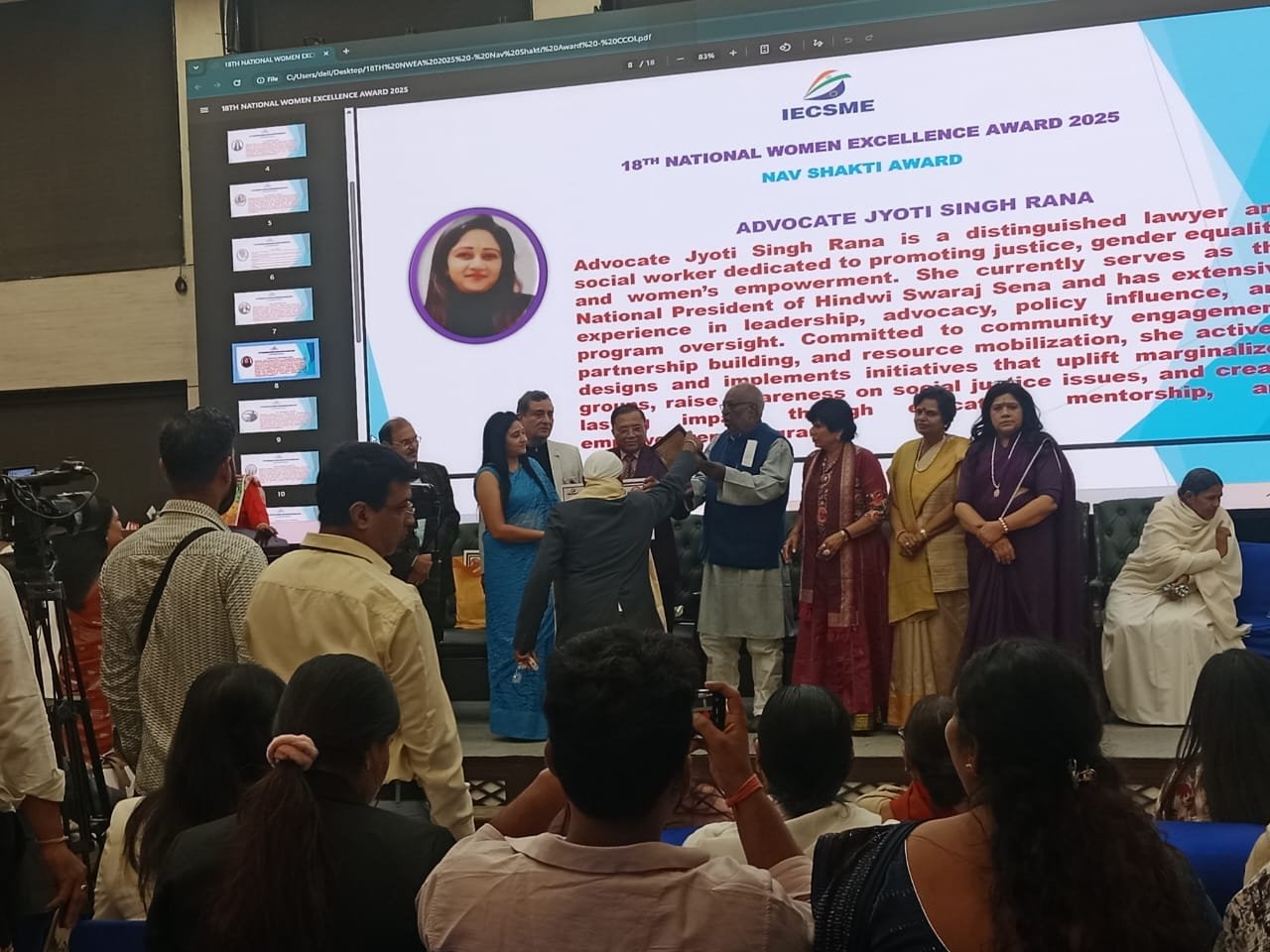 आशा ग्लोबल संगठन ने अधिवक्ता ज्योति सिंह राणा को हजारों महिलाओं के बीच 18BA नेशनल वुमन एक्सीलेंसी अवॉर्ड 2025 से सम्मानित किया। इस सम्मान को पाकर ज्योति ने कहा कि यह पुरस्कार केवल उनका नहीं, बल्कि उन सभी महिलाओं की प्रेरणा है जो अपने जीवन में आगे बढ़ने का संकल्प रखती हैं।