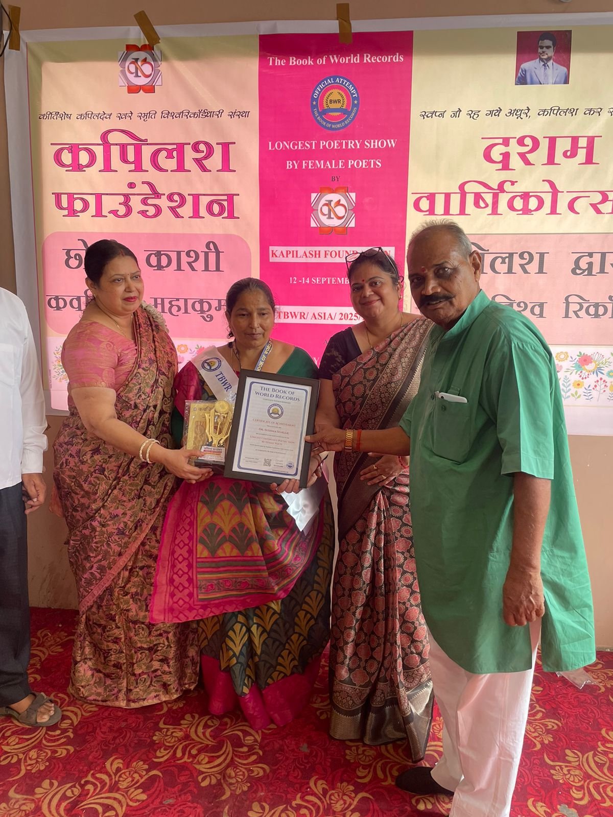 गोला गोकर्णनाथ (खीरी)। कपिलश फाउंडेशन द्वारा आयोजित ऐतिहासिक कवयित्री महाकुंभ में 105 कवयित्रियों ने 55 घंटे लगातार काव्य पाठ कर विश्व रिकॉर्ड बना दिया। यह आयोजन रॉयल लॉन, गोला गोकर्णनाथ में तीन दिनों तक निरंतर चला और द बुक ऑफ वर्ल्ड रिकॉर्ड्स, दुबई द्वारा मान्यता प्राप्त हुआ।
