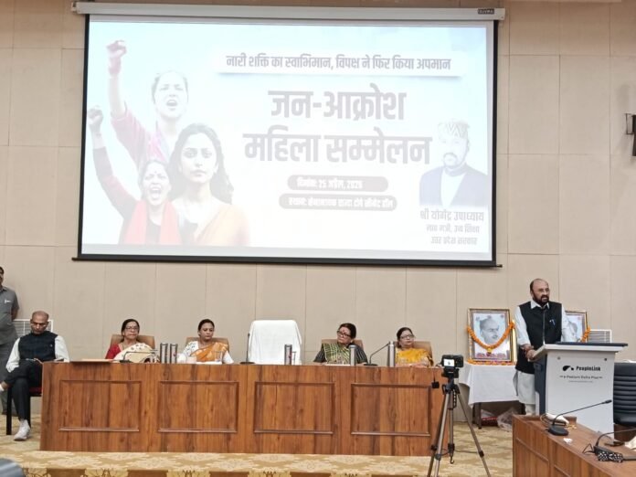 मुख्य अतिथि के रूप में संबोधित करते हुए योगेंद्र उपाध्याय ने कहा कि भारत में धरती को मातृ स्वरूप और सरस्वती, लक्ष्मी व दुर्गा को देवी के रूप में पूजने की परंपरा है। उन्होंने आरोप लगाया कि विपक्षी दलों ने नारी शक्ति वंदन अधिनियम का विरोध कर महिलाओं का अपमान किया है। उन्होंने कहा कि देश की महिलाएं इसका जवाब लोकतांत्रिक तरीके से देंगी।