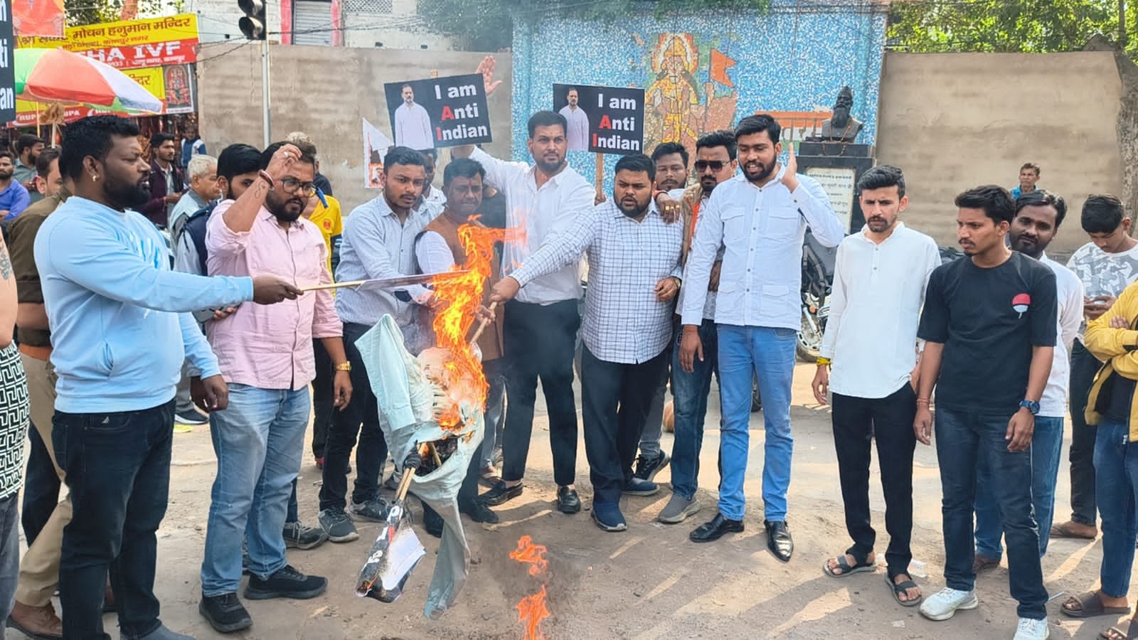 प्रदर्शन के दौरान कार्यकर्ता “राहुल गांधी होश में आओ” और “राहुल गांधी मुर्दाबाद” जैसे नारे लगाते हुए आगे बढ़े। बड़े चौराहे पर पहुंचकर कार्यकर्ताओं ने राहुल गांधी के पुतले को जूते-चप्पलों की माला पहनाई और आग के हवाले कर दिया।
