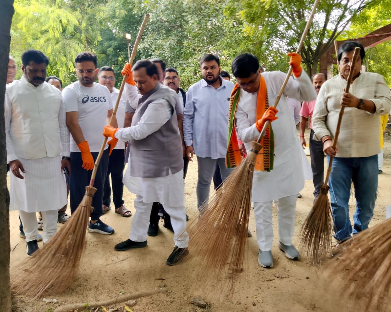 नेताओं ने गांधी प्रतिमा पर पुष्प अर्पित करने के बाद स्वच्छता अभियान भी चलाया।