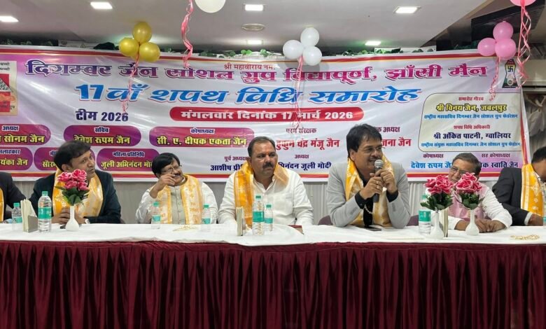 झांसी। दिगम्बर जैन सोशल ग्रुप विद्यापूर्ण, झांसी मुख्य शाखा का 17वां शपथ विधि समारोह 17 मार्च 2026 को होटल मार्वलस में आयोजित किया गया। इस अवसर पर झांसी सदर विधायक रवि शर्मा ने नवनियुक्त पदाधिकारियों को पद एवं गोपनीयता की शपथ दिलाई।