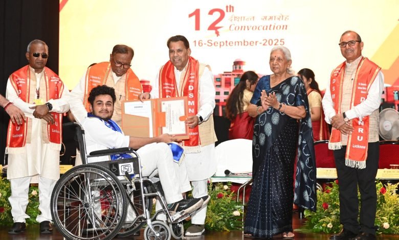 लखनऊ। उत्तर प्रदेश की राज्यपाल एवं राज्य विश्वविद्यालयों की कुलाधिपति आनंदीबेन पटेल की अध्यक्षता में आज डॉ. शकुंतला मिश्रा राष्ट्रीय पुनर्वास विश्वविद्यालय, लखनऊ का द्वादश दीक्षांत समारोह भव्यता के साथ संपन्न हुआ। समारोह में 1,803 विद्यार्थियों को विभिन्न उपाधियाँ प्रदान की गईं, जबकि 143 मेधावी छात्रों को कुल 166 पदकों से सम्मानित किया गया। इनमें 76 पदक छात्राओं और 67 पदक छात्रों को दिए गए, साथ ही 27 दिव्यांग विद्यार्थियों को भी पदक प्रदान किए गए।