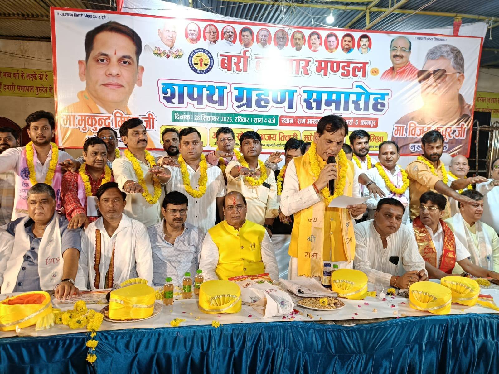 कानपुर नगर। बर्रा इकाई व्यापार मंडल का शपथ ग्रहण समारोह रविवार को बर्रा-5 स्थित राम आस्था गेस्ट हाउस में भव्य रूप से आयोजित किया गया। इस अवसर पर व्यापार मंडल के प्रदेश अध्यक्ष मुकुंद मिश्रा ने नवगठित कार्यकारिणी को शपथ दिलाई और सभी पदाधिकारियों को व्यापारियों की सेवा और संगठन को मजबूत करने का संकल्प कराया।