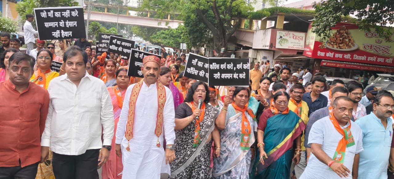 जिला अध्यक्ष अनिल दीक्षित व शिवराम सिंह के नेतृत्व में महिला मोर्चा की कार्यकर्ता भाजपा कार्यालय नवीन मार्केट से जुलूस की शक्ल में रवाना हुईं। हाथों में तख्तियां लिए कार्यकर्ता “कांग्रेस शर्म करो, नारी अपमान बंद करो”, “जो मां का नहीं करे सम्मान वो इंसान नहीं हैवान”, “मां का अपमान कांग्रेस की पहचान” जैसे नारे लगाती हुईं तिलक हाल पहुंचीं।