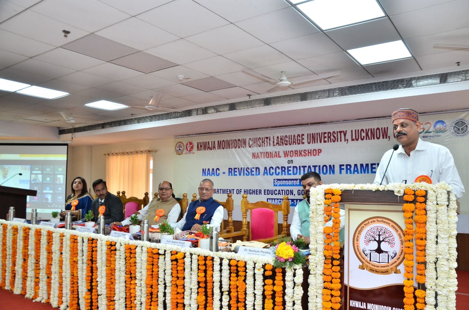 लखनऊ। केएमसी भाषा विश्वविद्यालय में उच्च शिक्षा विभाग उत्तर प्रदेश के सहयोग से दो दिवसीय नैक संशोधित मूल्यांकन पद्धति विषय पर कार्यशाला का आज आरंभ हुआ। कार्यशाला के उद्घाटन सत्र के मुख्यातिथि के रूप में प्रो जीसी त्रिपाठी, पूर्व अध्यक्ष उच्च शिक्षा समिति, उत्तर प्रदेश, विशिष्ट अतिथि प्रो राजेश सिंह, कुलपति, गोरखपुर विश्वविद्यालय तथा नैक की राष्ट्रीय कार्यकारिणी से डॉ वहीदुल हसन, सीनियर कम्यूनिकेशन अधिकारी तथा डॉ नीलेश पांडे, असिस्टेंट एडवाइजर नैक विश्वविद्यालय के कुलपति प्रो एनबी सिंह एवं कार्यक्रम के संयोजिका डॉ तनु डंग उपस्थित रहे। कार्यक्रम में व्यवसाय प्रशासन विभाग के सह आचार्य, डॉ मुशीर अहमद की किताब ‘आत्म निर्भर भारत’ का विमोचन भी किया गया।
