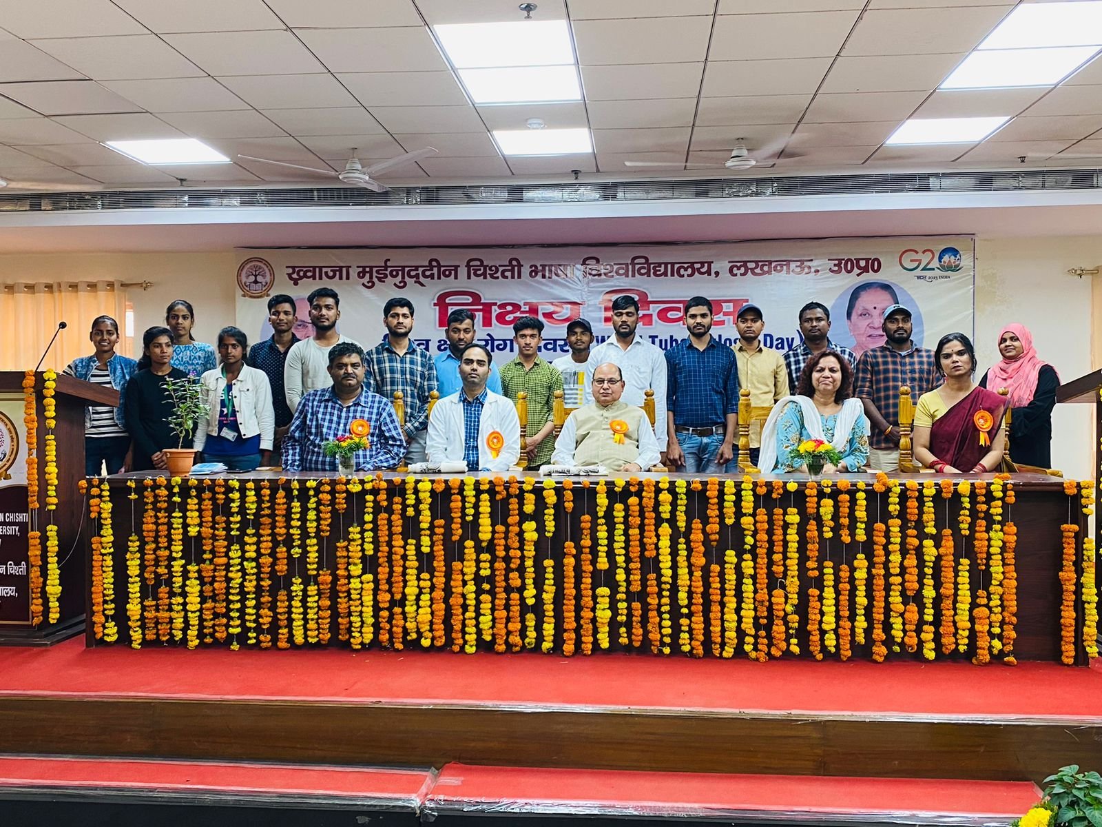 लखनऊ। ख्वाजा मुईनुद्दीन चिश्ती भाषा विश्वविद्यालय में आज अंतर्राष्ट्रीय निक्षय दिवस के उपलक्ष्य में निक्षय दिवस मनाया गया। कार्यक्रम में अतिथियों का स्वागत एवं कार्यक्रम की प्रस्तावना कार्यक्रम के समन्वयक एवं कुलानुशासक डॉ नीरज शुक्ल ने दी ।कार्यक्रम में कैरियर मेडिकल कॉलेज के पल्मोनरी विभाग के विभागाध्यक्ष डॉ राघवेंद्र सिंह ने विद्यार्थियों को क्षय रोग से बचाव के तरीकों तथा उपचार के बारे में विस्तार से बताया ।कार्यक्रम में विश्वविद्यालय के माननीय कुलपति प्रो एन.बी. सिंह के द्वारा विश्वविद्यालय के गोद लिए क्षय रोगियों तथा उनके प्रतिनिधियों को “पोषण पोटली” का वितरण किया गया।।कार्यक्रम का संचालन कार्यक्रम की संयोजक डॉ नलिनी मिश्रा ने किया।