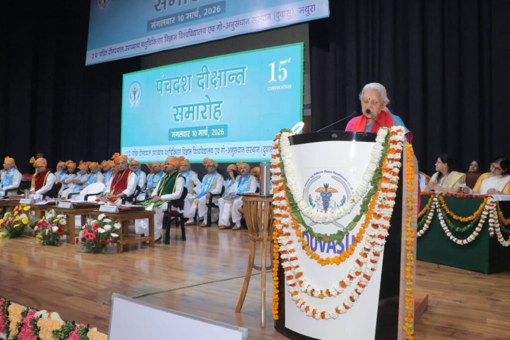मथुरा। उत्तर प्रदेश की राज्यपाल एवं विश्वविद्यालय की कुलाधिपति आनंदीबेन पटेल की अध्यक्षता में पंडित दीन दयाल उपाध्याय पशु चिकित्सा विज्ञान विश्वविद्यालय एवं गो-अनुसंधान संस्थान, मथुरा का 15वां दीक्षांत समारोह आयोजित किया गया। समारोह में कुल 177 विद्यार्थियों को उपाधियां प्रदान की गईं।