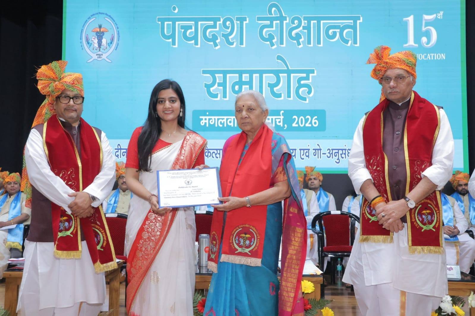 इनमें 69 बीवीएससी एवं एएच, 74 स्नातकोत्तर, 5 पीएचडी और 29 बायोटेक्नोलॉजी की उपाधियां शामिल रहीं। उत्कृष्ट प्रदर्शन करने वाले विद्यार्थियों को 14 स्वर्ण, 4 रजत और 2 कांस्य सहित कुल 20 पदक प्रदान किए गए। इसके अलावा 4 सर्वश्रेष्ठ शोधप्रबंध (स्नातकोत्तर), 1 सर्वश्रेष्ठ शोधप्रबंध (पीएचडी) और 1 सर्वश्रेष्ठ शिक्षक पुरस्कार भी दिए गए।