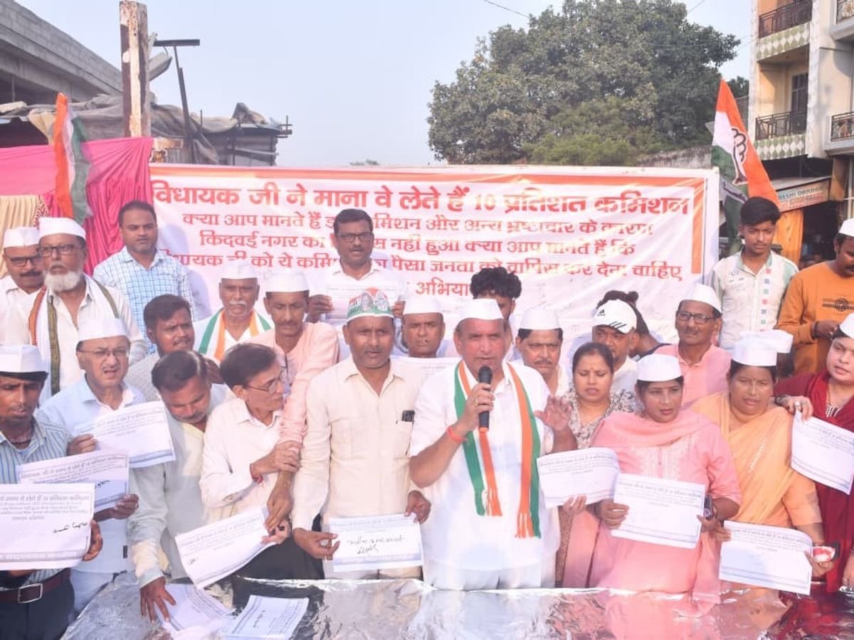 कानपुर नगर। भाजपा विधायक महेश त्रिवेदी के 10 प्रतिशत कमीशन लेने के कबूलनामे के विरोध में कांग्रेस ने रविवार को किदवई नगर विधानसभा के जूही क्षेत्र में हस्ताक्षर अभियान चलाया। कांग्रेसजनों ने अध्यक्ष पवन गुप्ता के नेतृत्व में गांधी टोपी पहनकर और रामधुन गाते हुए टूटी सड़कों के पास जनता से हस्ताक्षर करवाए।