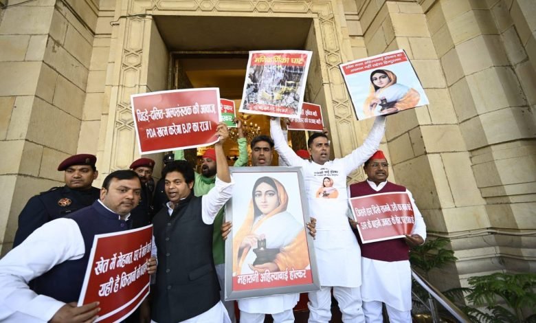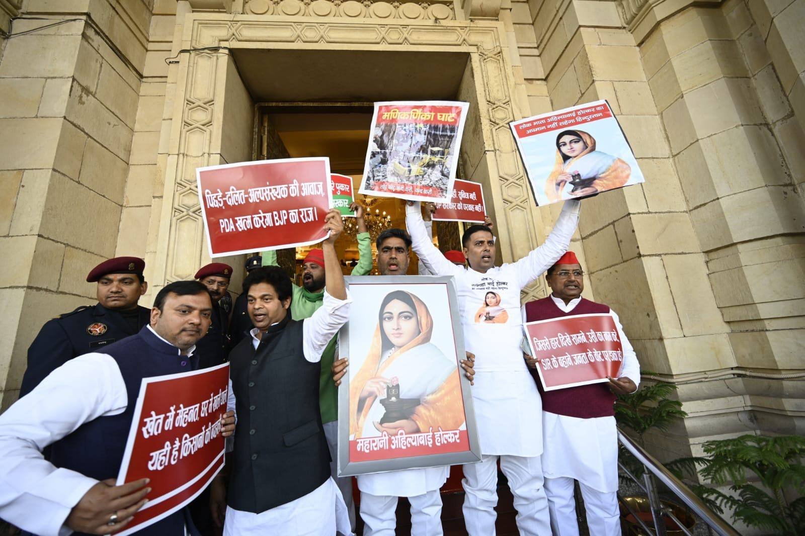 लखनऊ। समाजवादी पार्टी के सभी विधायकों ने लोकमाता देवी अहिल्याबाई होल्कर द्वारा निर्मित मणिकर्णिका घाट को तोड़े जाने, एसआईआर के नाम पर लोकतंत्र की हत्या, किसानों की बदहाली, बढ़ती महंगाई एवं बेरोजगारी, ध्वस्त कानून व्यवस्था तथा महिलाओं के खिलाफ बढ़ते अपराधों सहित विभिन्न जनहित के मुद्दों को लेकर विधानसभा भवन परिसर में पूर्व प्रधानमंत्री चौधरी चरण सिंह की प्रतिमा के समक्ष धरना-प्रदर्शन किया।