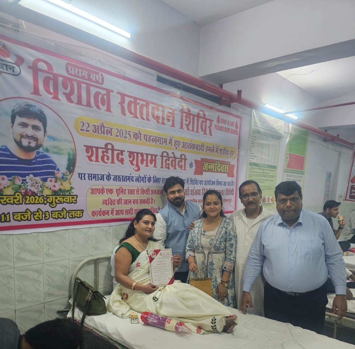 कानपुर नगर। देश के लिए सर्वोच्च बलिदान देने वाले शहीद शुभम द्विवेदी की पावन स्मृति में रक्तदान शिविर का आयोजन किया गया। 22 अप्रैल 2025 को पहलगाम आतंकी हमले में शहीद हुए शुभम द्विवेदी को श्रद्धांजलि स्वरूप आयोजित इस शिविर में युवाओं और सामाजिक कार्यकर्ताओं ने उत्साहपूर्वक भाग लिया।