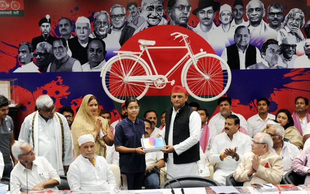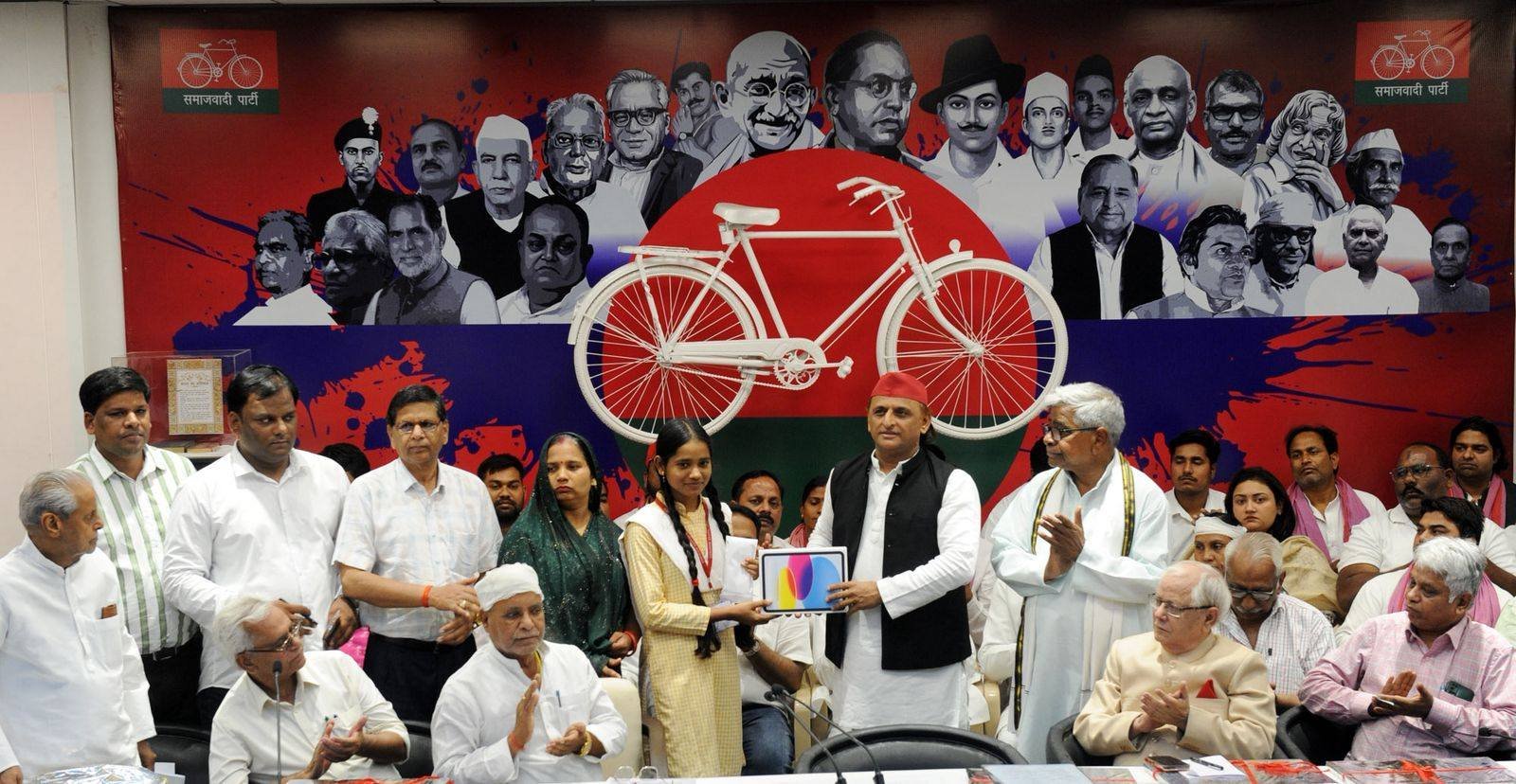 सपा प्रमुख अखिलेश यादव ने बोर्ड टॉपर्स को किया सम्मानित, मेधावी छात्राओं को दिए आईपैड