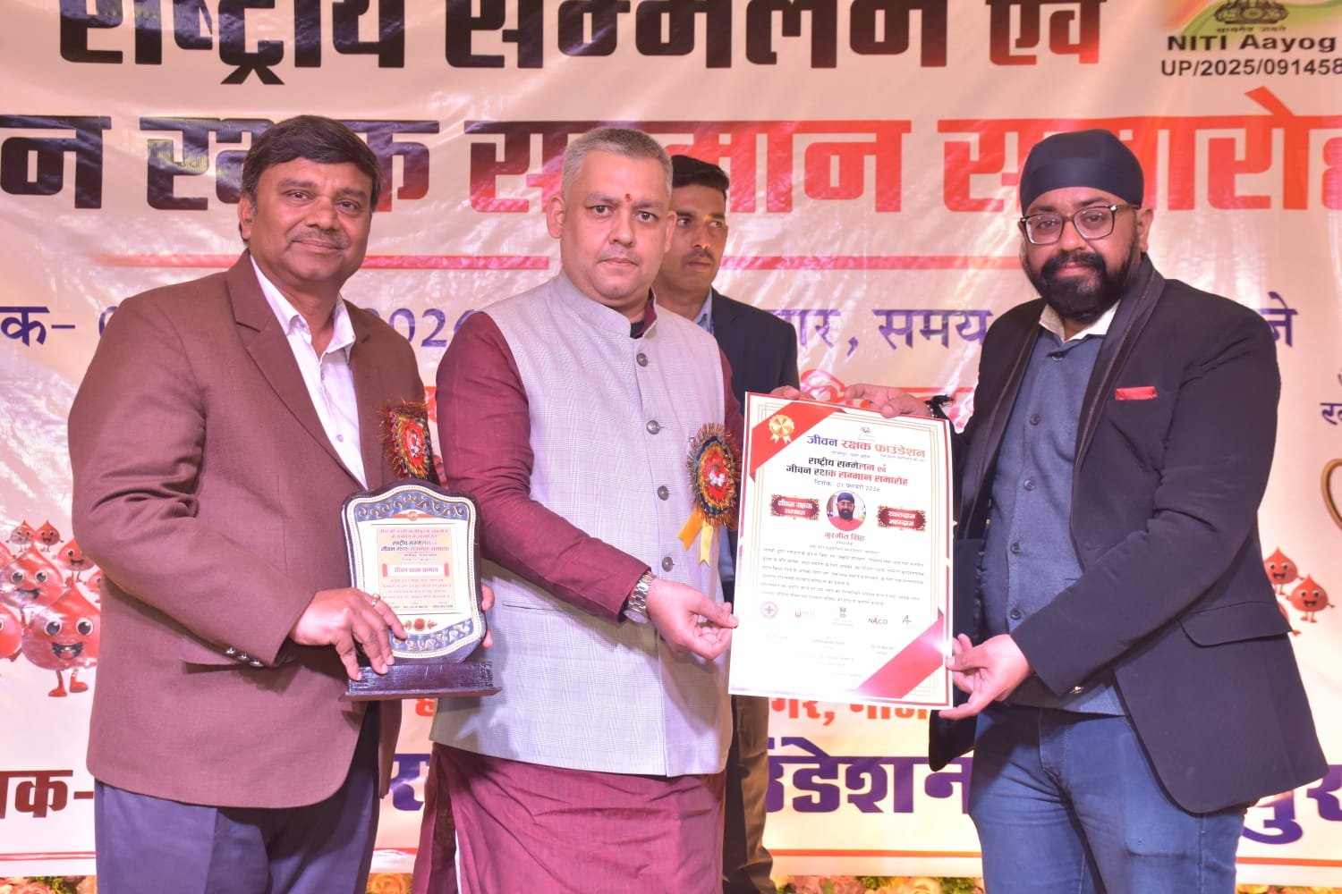 सम्मान जम्मू-कश्मीर के उपराज्यपाल मनोज सिन्हा के पुत्र एवं वरिष्ठ भाजपा नेता अभिनव सिन्हा द्वारा प्रदान किया गया। इस अवसर पर सर्व फॉर ह्यूमैनिटी फाउंडेशन की ओर से संस्था के प्रबंधक गुरमीत सिंह और सक्रिय रक्तदाता सतीश शर्मा सम्मान ग्रहण करने पहुंचे।