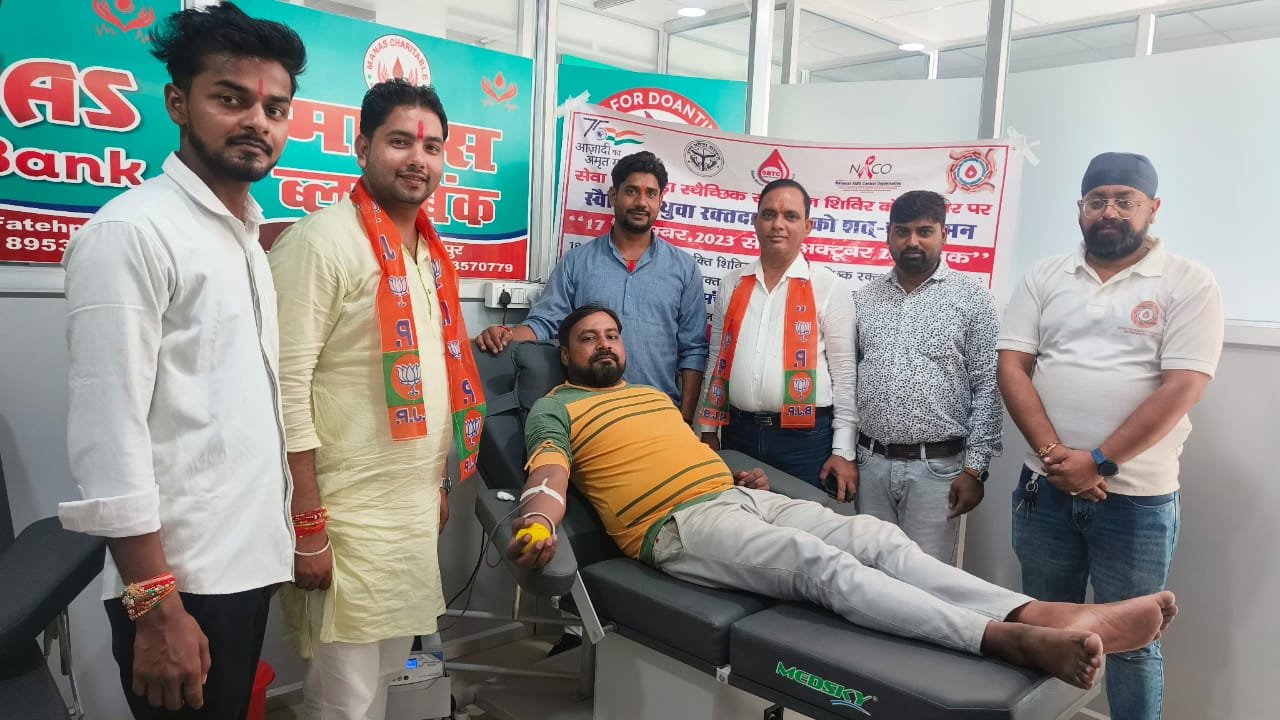 फतेहपुर। प्रत्येक वर्ष की भांति इस वर्ष भारतीय जनता युवा मोर्चा द्वारा भारत के यशश्वी प्रधानमंत्री नरेंद्र मोदी जी के जन्मदिन के अवसर पर चल रहे सेवा पखवाड़ा के अंतर्गत रक्तदान शिविर का आयोजन किया। आपको बताते चले कि भाजयुमो द्वारा विगत 12 सितंबर से रक्तदान शिविर का आयोजन किया जा रहा है, जोकि 2 अक्टूबर लगातार चलेगा। इसी क्रम में आज सदर अस्पताल में भी रक्तदान शिविर का फीता काटकर उद्घाटन क्षेत्रीय अध्यक्ष सुनील साहू, जिलाध्यक्ष मधुराज विश्वकर्मा, संयोजक प्रसून तिवारी ने किया। वही सहयोगी संस्था सर्व फार ह्यूमैनिटी सहयोगी संस्थान के रूप के सहयोग रहा। शिविर में 35 लोगो ने रक्तदान किया। मधुराज विश्वकर्मा ने बताया की शिविर लगातार 2 अक्टूबर तक चलता रहेगा। जिसमे जिला अस्पताल रक्तकेन्द्र में लगे रक्तदान शिविर में क्षेत्रीय अध्यक्ष सुनील साहू ,भाजयुमो जिलाध्यक्ष मधुराज विश्वकर्मा व महामंत्री प्रसुन तिवारी सहित 15 रक्तदानियों ने रक्तदान किया।