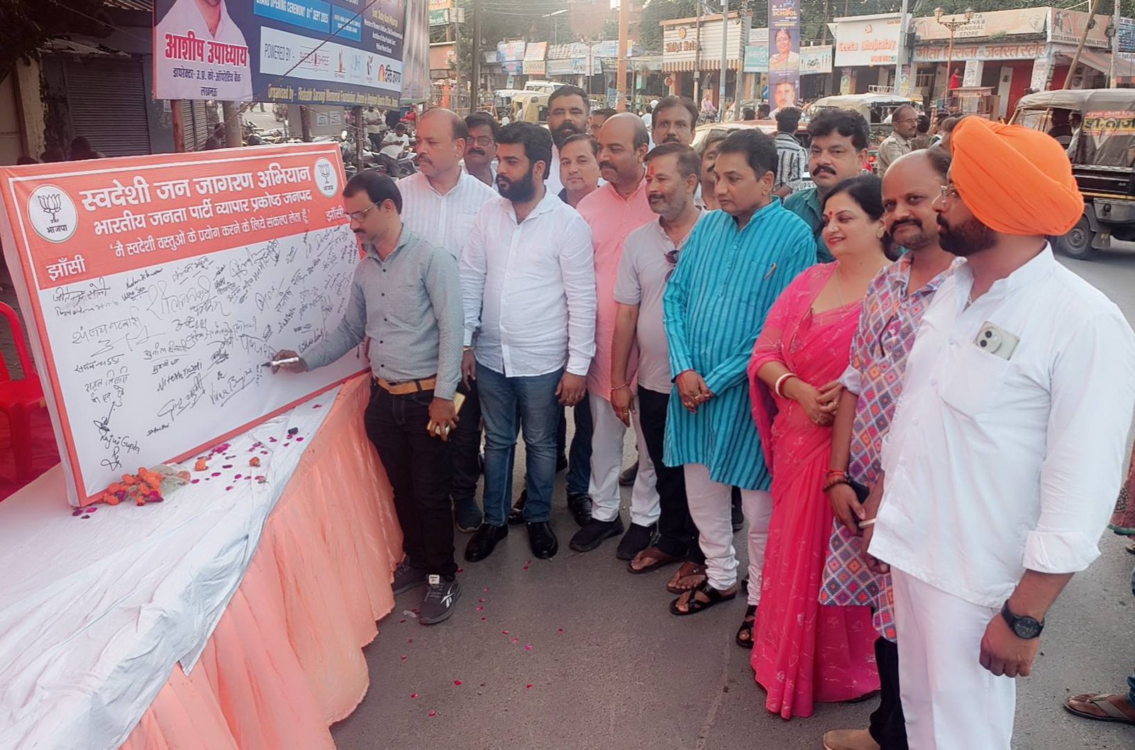 झांसी। स्वदेशी जन जागरण अभियान के अंतर्गत भारतीय जनता पार्टी के व्यापारी प्रकोष्ठ द्वारा इलाइट चौराहे पर विशाल हस्ताक्षर अभियान का आयोजन किया गया। “स्वदेशी अपनाओ – देश बचाओ” के संदेश के साथ हुए इस कार्यक्रम में भारी संख्या में व्यापारी, सामाजिक कार्यकर्ता और आमजन ने भाग लेकर स्वदेशी अभियान को समर्थन दिया।