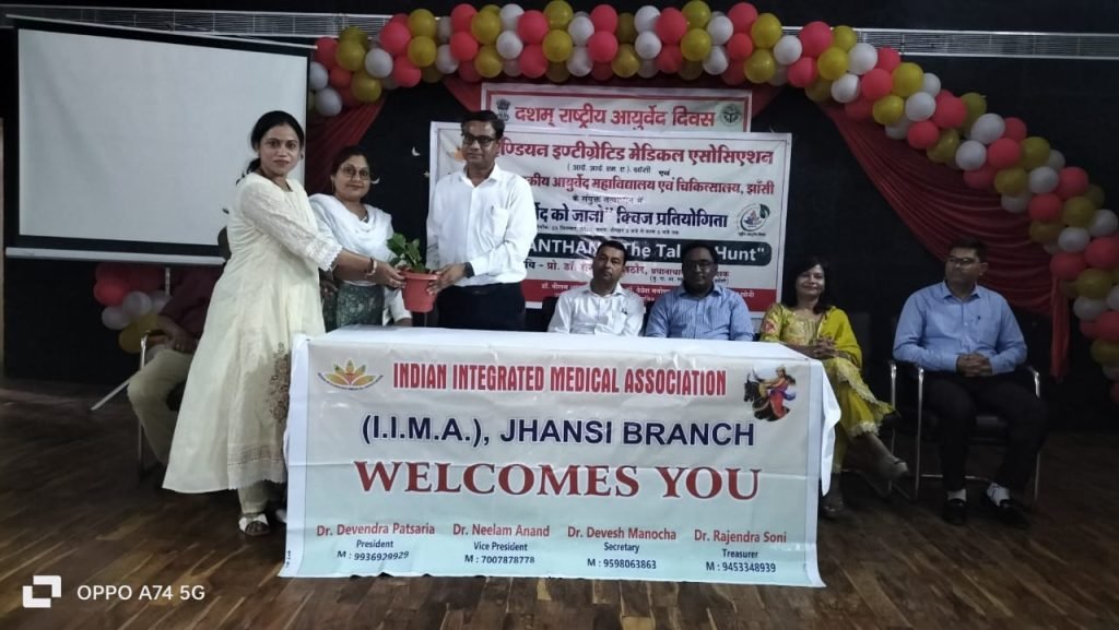 झांसी। आज दसवें राष्ट्रीय आयुर्वेद दिवस के अवसर पर इण्डियन इंटीग्रेटिड मेडिकल एसोसिएशन (आई.आई.एम.ए.), झांसी द्वारा बुंदेलखंड राजकीय आयुर्वेदिक महाविद्यालय एवं चिकित्सालय के ऑडिटोरियम में “आयुर्वेद को जानो” थीम पर आधारित “AYURMANTHAN – The Talent Hunt” क्विज प्रतियोगिता का आयोजन किया गया। इस कार्यक्रम के मुख्य अतिथि महाविद्यालय के प्रधानाचार्य प्रो. डॉ. राम कृष्ण राठौर थे, जबकि अध्यक्षता डॉ. देवेन्द्र पटसारिया ने की। कार्यक्रम का संयुक्त नेतृत्व डॉ. अम्बर साहू एवं डॉ. अर्पित श्रीवास ने किया।