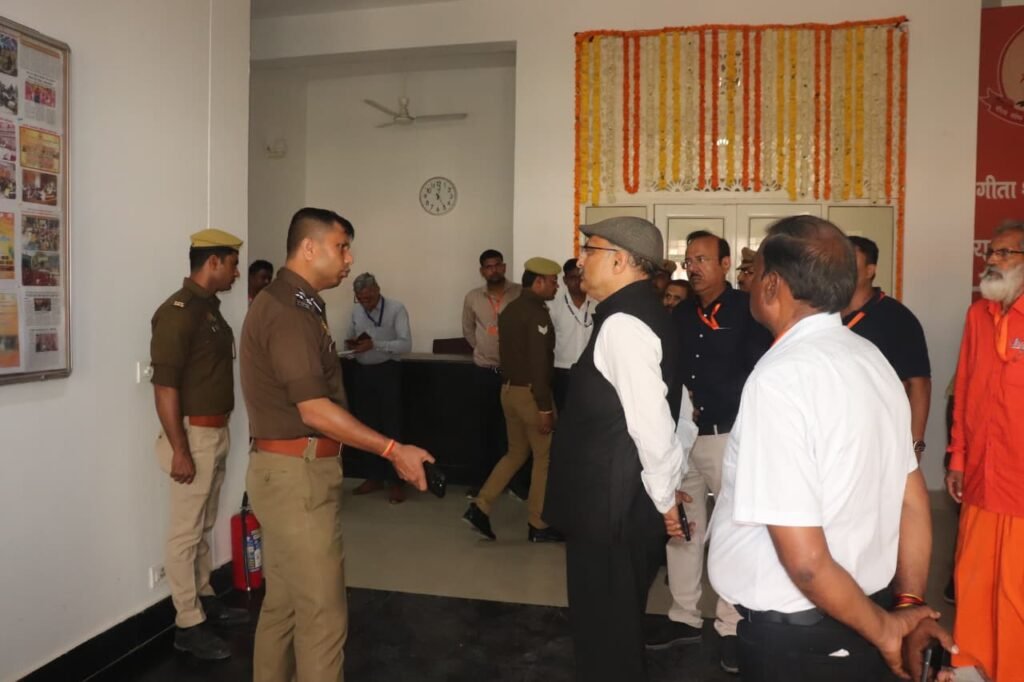 मथुरा। उत्तर प्रदेश के मुख्यमंत्री के प्रस्तावित कार्यक्रम को लेकर मथुरा में सुरक्षा व्यवस्था को लेकर पुलिस प्रशासन अलर्ट है। इसी क्रम में आगरा रेंज के डीआईजी शैलेश पांडेय ने आयुक्त आगरा मंडल, जिलाधिकारी और वरिष्ठ पुलिस अधीक्षक मथुरा के साथ गीता शोध संस्थान में आयोजित होने वाले कार्यक्रम स्थल का निरीक्षण कर सुरक्षा व्यवस्थाओं की समीक्षा की।