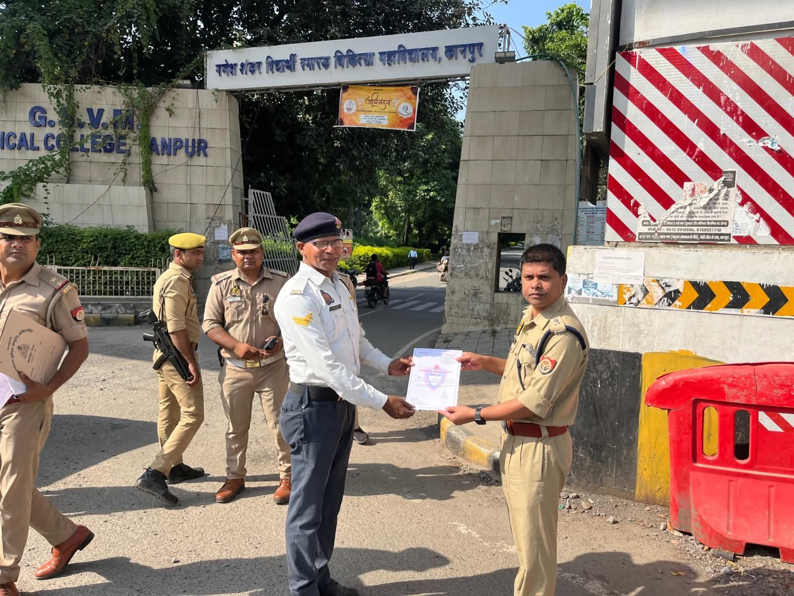 कानपुर नगर। 13 सितम्बर 2025 को पुलिस उपायुक्त (यातायात) रवींद्र कुमार ने जीएसवीएम मेडिकल कॉलेज गेट पर जिम्मेदारी और लगन से ड्यूटी निभाने पर हेड कांस्टेबल सर्वेश कुमार को प्रशस्ति पत्र देकर सम्मानित किया। उन्होंने सर्वेश कुमार की कर्तव्यपरायणता की सराहना करते हुए उनके उज्ज्वल भविष्य की कामना की।